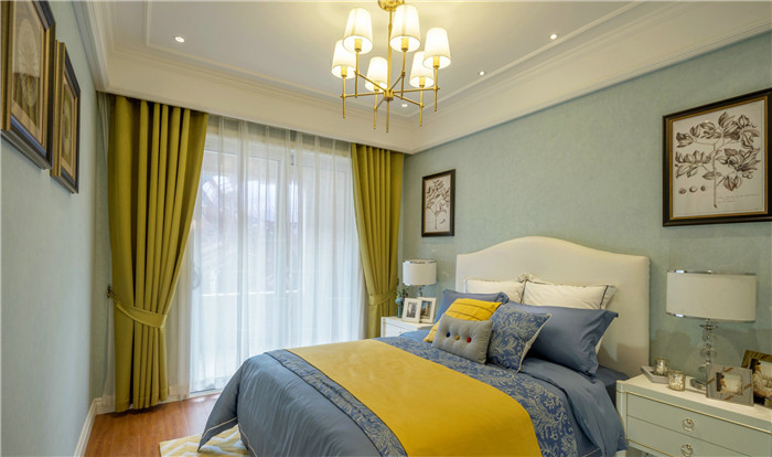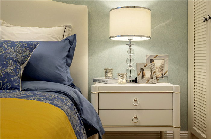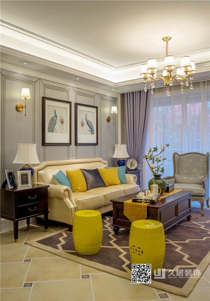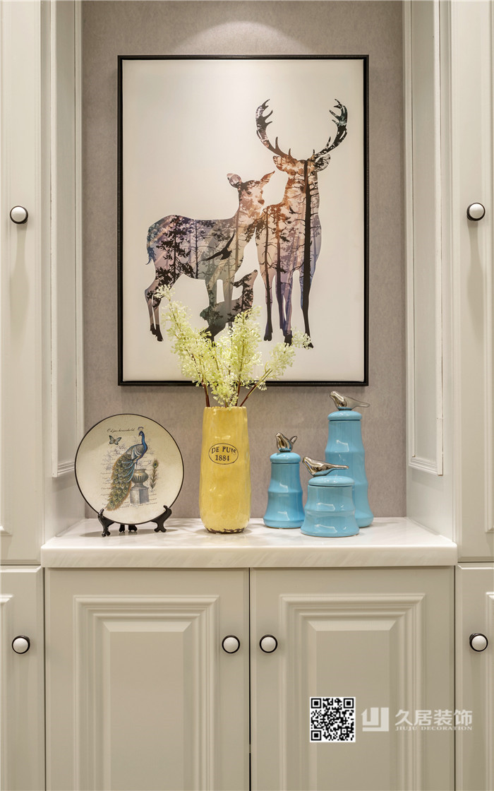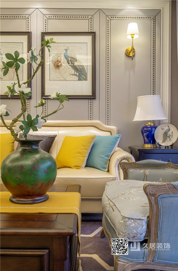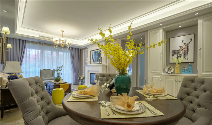 本案以?xún)?yōu)雅的美式風(fēng)格定位,主色調(diào)采用藍(lán)灰色系,空間點(diǎn)綴檸檬黃、芥末綠、孔雀藍(lán),眾多顏色和諧相處,整個(gè)空間彌漫著典雅與溫馨的格調(diào)。在整個(gè)設(shè)計(jì)當(dāng)中,設(shè)計(jì)師巧妙的融入了一抹雅致的中式情懷,古色古香的圓鼓凳、鳥(niǎo)類(lèi)的瓷瓶,增添了一些小的意趣。